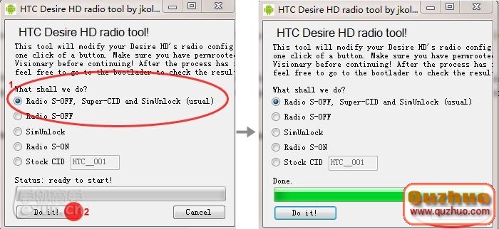 2、選擇Radio S-OFF,Super-CID and SimUnlock(usual),並點擊Do it,完成之後重啟手機。