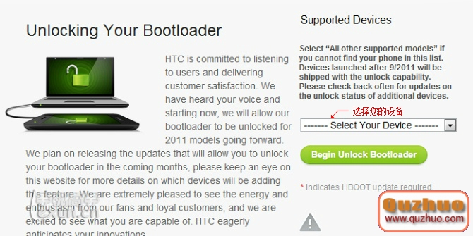 5).進入解鎖頁面後,選擇您的機型,然後點擊「Begin Unlock Bootloader」