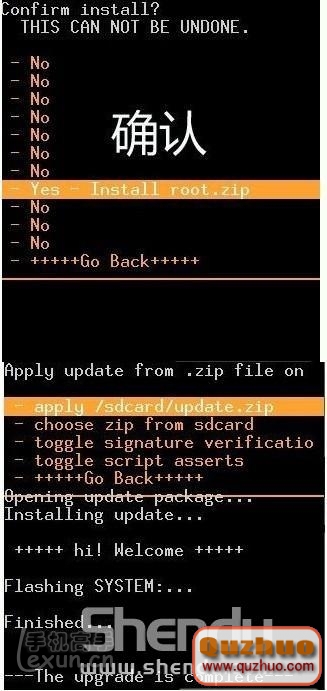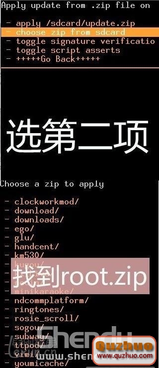 3、選擇第二項:Choose zip from sdcard(選擇從SD卡升級包更新) 並確認,再在選項中找到Root確認,再確認一次即開始刷入ROOT。