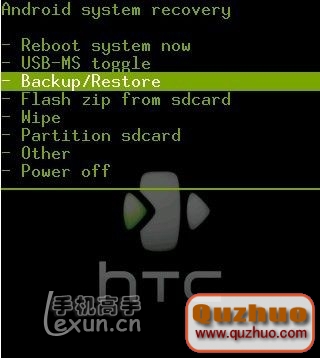 1、手機在完全關機狀態下按住音量下鍵不放,然後按電源鍵,進入HBOOT模式; 進入HBOOT之後選擇“recovery”然後按&ldquo