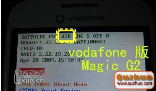 方法: 關機狀態下,按下開機鍵、然後再按住返回鍵。機器就會自動出現這個Hboot的界面,大家直接查看第一行是32A還是32B即可!