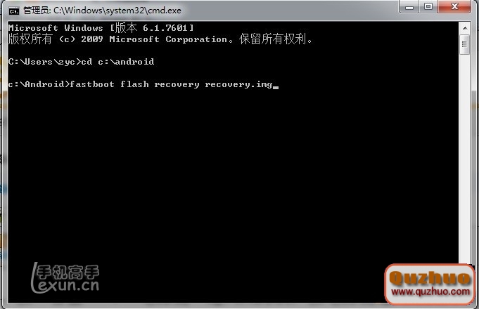 4、輸入cd c:\\Android(回車) 再輸入fastboot flash recovery recovery.img(回車)