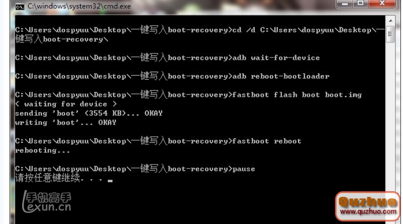 4.雙擊運行一鍵寫入boot 的文件夾中的 fastboot一鍵刷入boot.bat 即可,