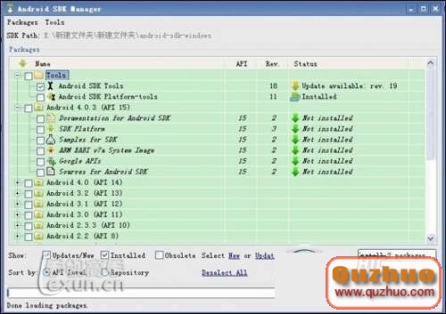在下載界面,將“Android SDK Tools”勾選,最下方有“USB驅動”也可以勾選上,然後點擊Install 2 packages,再點擊Install