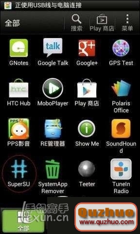 HTC One V官方解鎖操作成功的話,接下來就很簡單了,直接運行步驟10裡下載的附件,One V會自動進入fastboot,並獲取ROOT權限,完後會重新啟動,當看到這個界面中出現supersu圖標,就表示獲取權限成功了。