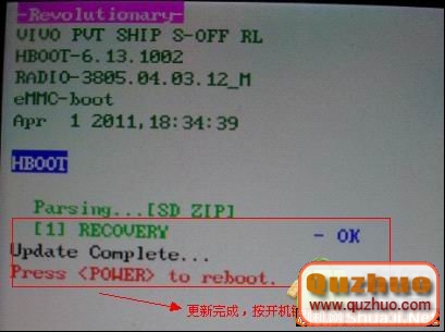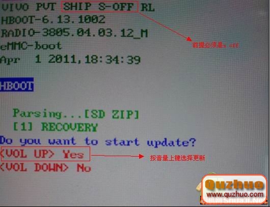手機關機,按住音量下+電源鍵開機,手機進入hboot模式,手機檢測到PG32IMG.zip,