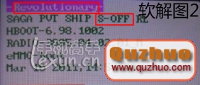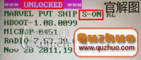 硬解後,使用ruu刷機,第一行可能有粉色底字UNLOCKED、LOCKED等信息,第二行是S-off;