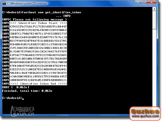 九、回到剛才的命令提示符界面,輸入:fastboot flash unlocktoken Unlock_code.bin回車,會提示發送成功(圖七)。