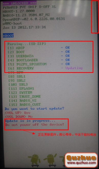 開機後,刪除存儲卡上PG58IMG.zip,否則每次進入hboot,會提示升級系統。