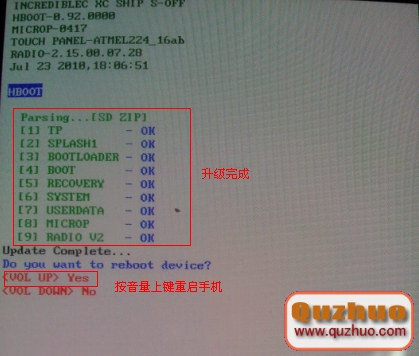 出現如上圖所示表示系統更新刷入成功,手動按音量上鍵進入系統即可。