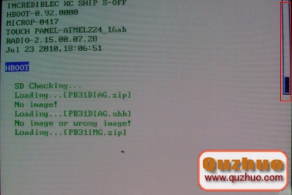 1.一台已經S-OFF的HTC Incredible,判斷S-off方法,手機關機狀態下按住音量下不放手同時按住開機鍵進入hboot模式,等待出現如下圖所示: