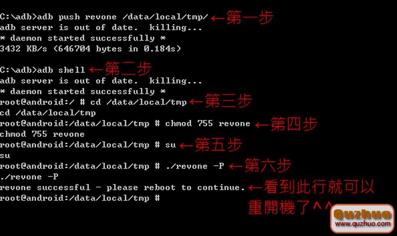 請手動重啟手機後拔掉數據線,www.shuleba.com電腦關閉DOS窗口,手機重新開機後連接www.shuleba.com電腦,重開一個DOS窗口,再做一次步驟1~2後
