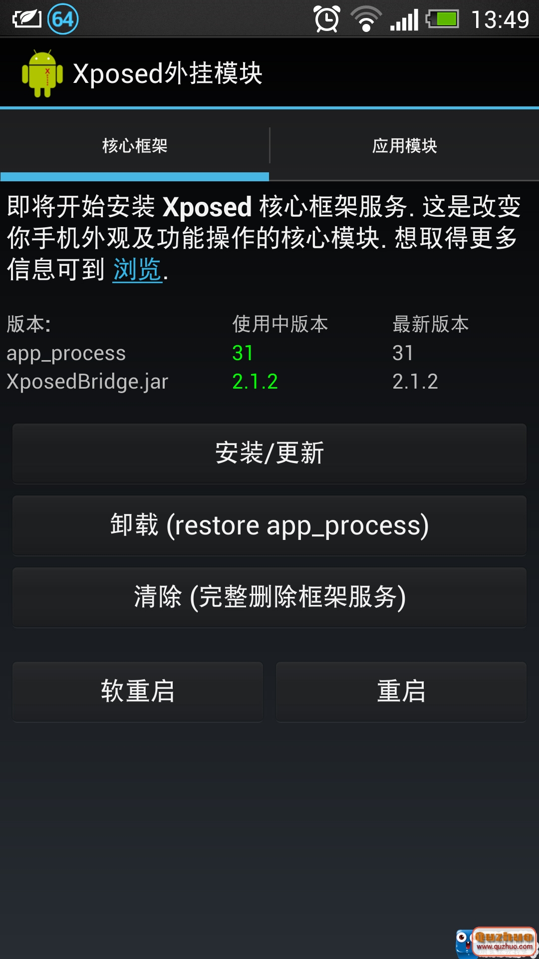 步驟二:先打開Xposed Installer,在“核心框架”界面點擊(安裝/更新),系統會自動加載,有可能會重啟。這一步很關鍵。