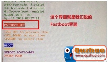 1、手機要進入fastboot模式,進入的方法:先徹底的關閉手機,然後按住手機的音量下鍵 + 電源鍵開機(兩鍵一起按不要松),過一會就進入HBOOT模式,然後再按一下電源鍵即可進入fastboot,然後用數據線連接www.shuleba.com電腦,如果連接正確的話此時就會顯示fastboot usb,如下圖: