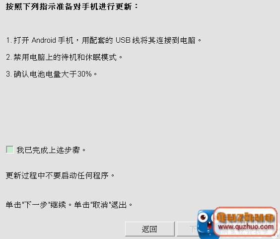 6.將顯示一條確認信息,表明在 Android 手機上安裝必要文件 (包括無線電通訊模塊映像) 所需時間。單擊下一步開始更新。更新過程中,屏幕上會顯示不停變化的進度條。
