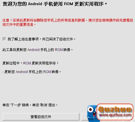 警告:安裝 ROM 更新實用程序 (RUU) 將會刪除 Android 手機上的所有信息和數據。