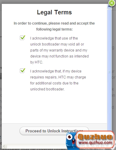 3、彈出提醒窗口,提醒你解鎖bootloader會失去保修,我們勾上兩個復選框,然後點擊“Proceed to Unlock Instructions”