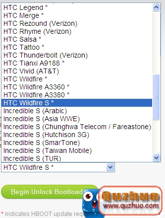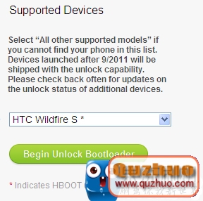 1、登錄HTC官方解鎖界面:http://www.htcdev.com/bootloader/ (必須登錄,沒有注冊的同志需要先注冊),右側選擇我們的機型HTC Wildfire S。然後點擊“Begin Unlock Bootloader”。