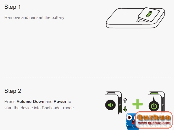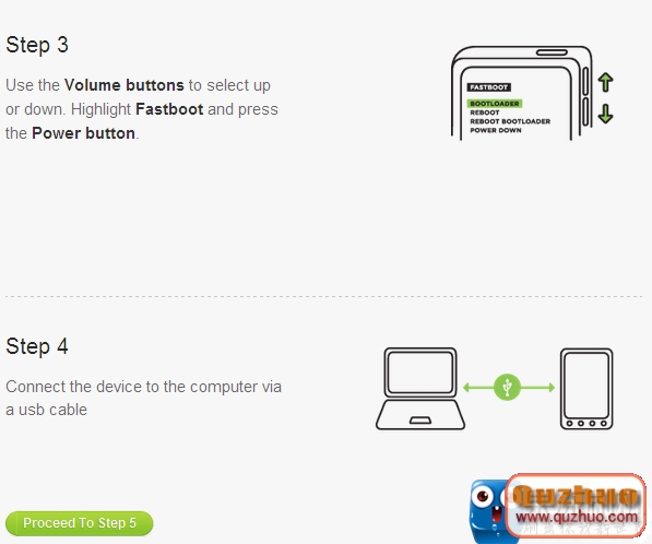 5、這時跳轉到http://www.htcdev.com/bootloader/unlock-instructions 頁面,這裡面一共四個步驟,很簡單:拔插電池;同時按住(特別注意是按住)按音量減和電源鍵;用音量鍵上下調整到Bootloader項並用電源鍵確認;數據線連接到www.shuleba.com電腦。然後點擊“Proceed To Step 5”跳轉到下一步。