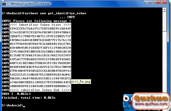 10、出現一大堆字符(會是下面兩個圖其中一種情況),我們右鍵點擊標記,然後用鼠標選中圖中高亮部分(按照你自己的情況選),然後點擊右鍵(此時已經復制到剪貼板中),然後粘貼到 http://www.htcdev.com/bootloader/unlock-instructions/page-3 網頁下面的文本框中,然後點擊下面的 Submit。