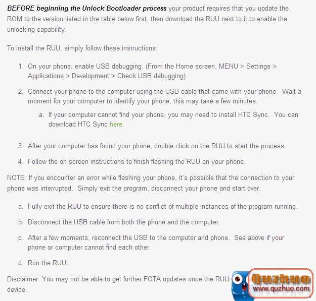 4、這時會跳轉到http://www.htcdev.com/bootloader/ruu-downloads 這個頁面是要告訴我們若要解鎖需要先安裝下面的RUU,在網頁最下方給出了對應機型版本的RUU,大概幾十M(不是完整的Rom,只是更新一下hboot,大家也不要奇怪,繼續操作就好)安裝RUU的教程基本上s-on的機油都會吧。大家選擇自己機型對應的版本刷上就好。不會的可以到論壇找。RUU刷完之後我們點擊這個頁面下方的“Proceed to Step 1”繼續