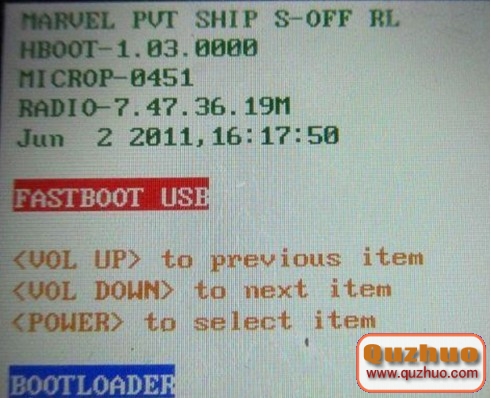 7、然後拔掉電池再裝上,按住電源鍵不松,再按音量減,進入HBOOT模式,看到上面顯示!是不是已經S-OFF(SHIP-OFF)?