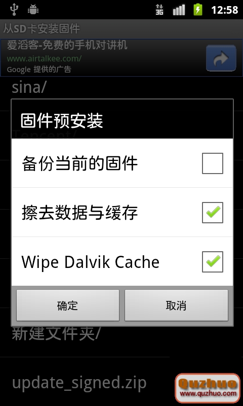 4、選擇ROM後,彈出對話框,選上第二第三項(wipe和清除數據),如果要備份數據,請自行把上面第一項選上(備份當前固件)