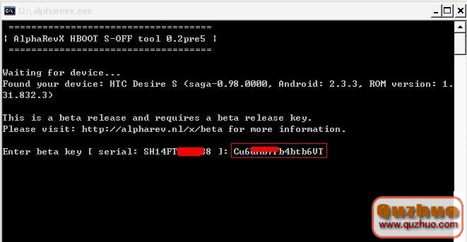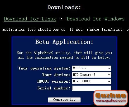 然後在上圖處菜單中填寫完整你的Desire S 並輸入你的SN號碼(看SN代碼的辦法,下電池,看電池艙就行了) 然後會得到下圖的一串代碼,復制下KEY碼,接下來要用的
