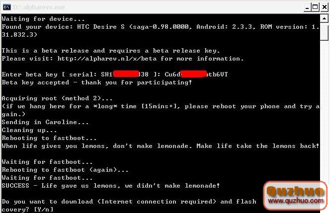 看到SUCCESS了嗎?說明成功了!下面有個Y/N,可以無視!按 Y下載RECOVERY,或者按N就會就退出了,手機自動重啟到HBOOT界面了