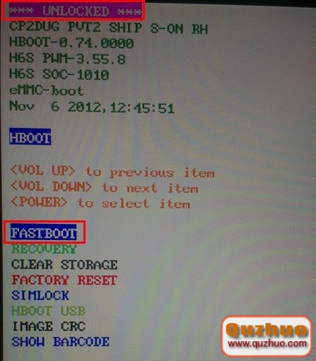 2.手動關機並取出電池5秒後再自行裝入,接著長按音量下+電源鍵進入Hboot模式;此時藍色框默認選擇Fastboot,按一下電源鍵確認進入Fastboot模式同時需確認為UNLOCKED狀態