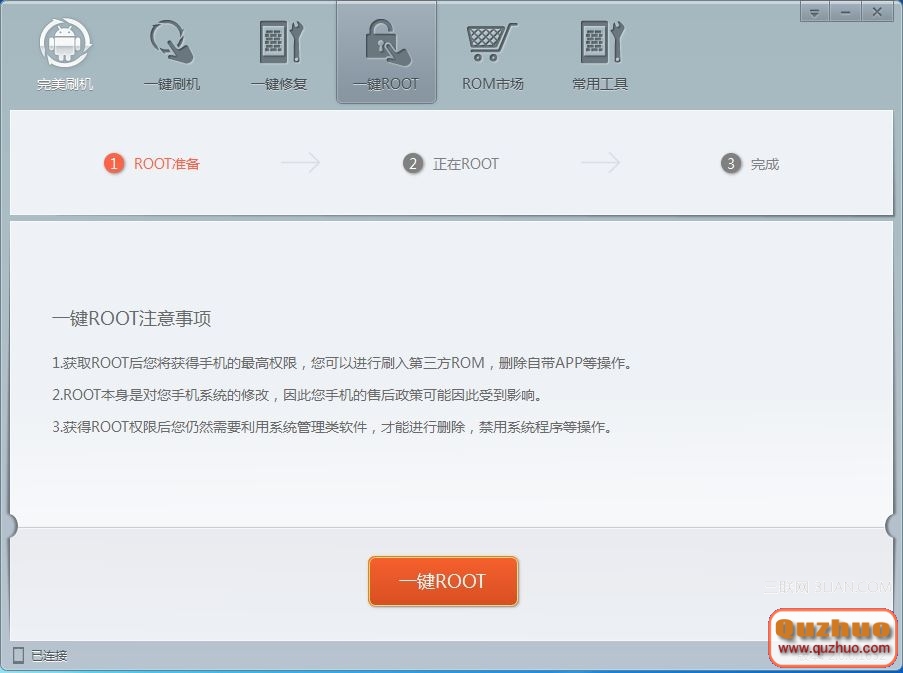一,獲得權限後可以刷入第三方Rom,刪除自帶App等等操作內容,二,獲取權限的手機,售後服務會受到影響。確認後點擊一鍵Root按鈕。