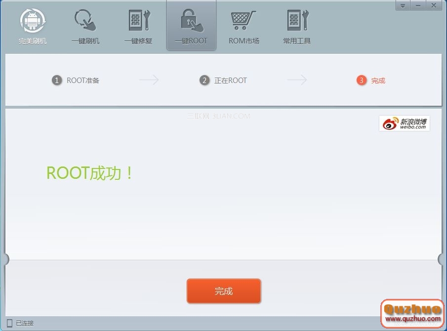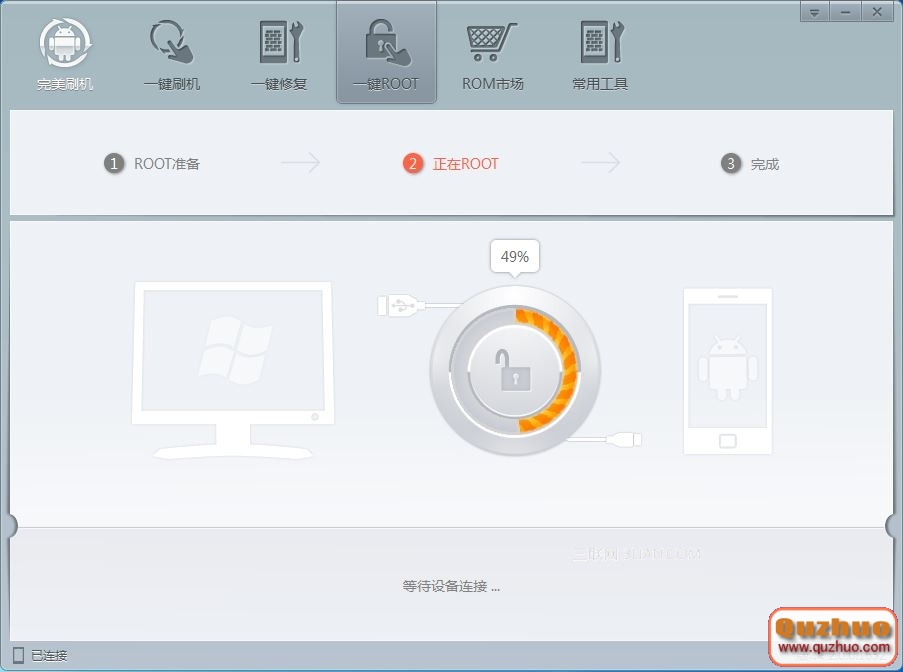 插上數據線連接好手機和www.shuleba.com電腦,打開完美刷機軟件,使用一鍵Root工具為HTC g10 Root。首先點擊一鍵Root,然後進入到一鍵Root模式。