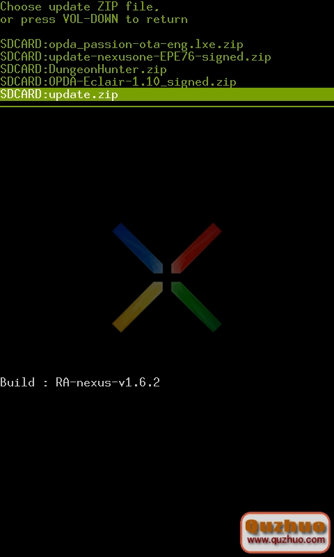 然後關機,按住側面的音量“—”鍵的同時按開機鍵,選擇進入recovery恢復模式,然後移動軌跡球到第四項,按下軌跡球選擇進入“Flash zip from sdcard”