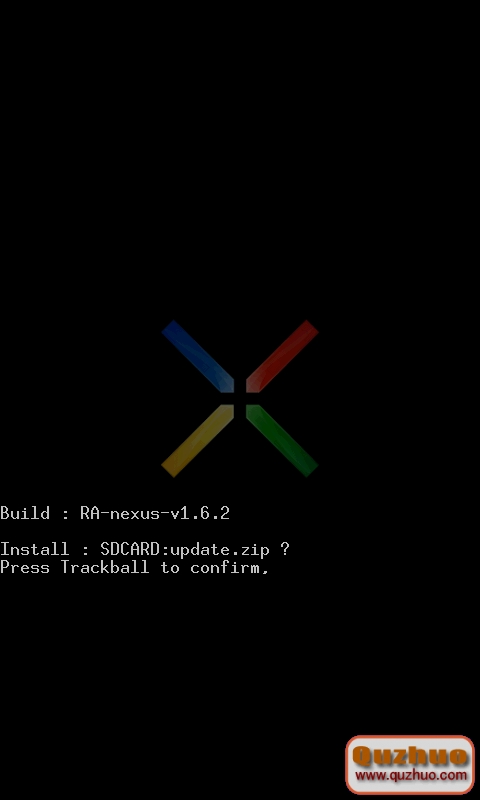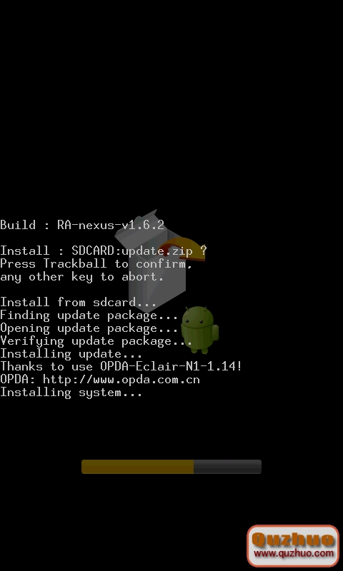 選擇update.zip後,會彈出如下圖提示。然後再按下軌跡球,就開始自動安裝系統刷機了。