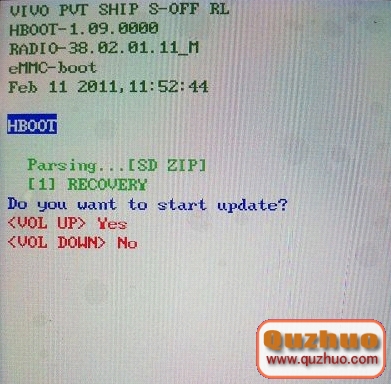 2.把手機關機,按住音量下鍵和電源鍵進入hboot界面(此時會自動檢查SD卡裡的更新文件)