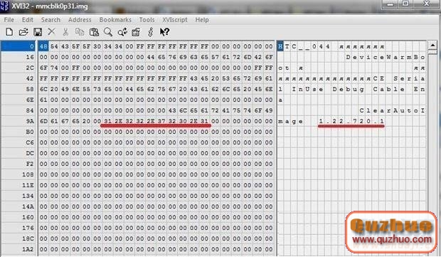 四、不要關閉命令窗口,再一次把手機由“僅充電”模式切換為“磁盤驅動器”模式,略等半分鐘,運行剛才下載的XVI32.exe,打開內存卡上的mmcblk0p31.img,在xvi32中修改你的ROM版本號為1.20.401.2,其他都不要改動,(本例為1.22.720.1修改為1.20.401.2),保存