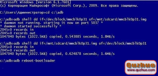 五、 再一次把手機由“磁盤驅動器”模式切換為“僅充電”模式,略等半分鐘。切換到剛才的命令窗口,輸入:adb shell dd if=/mnt/sdcard/mmcblk0p31.img of=/dev/block/mmcblk0p31回車。如果和第三步一樣提示出錯,一樣可采取三步命令法:依次輸入adb shell回車,su回車,dd if=/mnt/sdcard/mmcblk0p31.img of=/dev/block/mmcblk0p31回車,一般都可成功