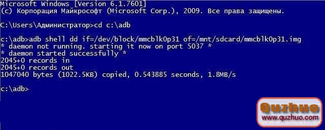 三、進入命令提示符,進入ADB目錄(參照官解步驟),輸入:adb shell dd if=/dev/block/mmcblk0p31 of=/mnt/sdcard/mmcblk0p31.img回車,正常的話顯示如下