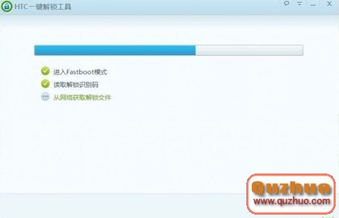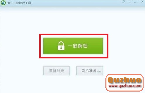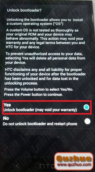2、打開HTC解鎖工具後界面,點擊一鍵解鎖,期間手機會重啟到Bootloader模式,一直等待解鎖工具提示操作後,選擇yes選項,音量鍵控制上下,電源鍵確認。如圖: