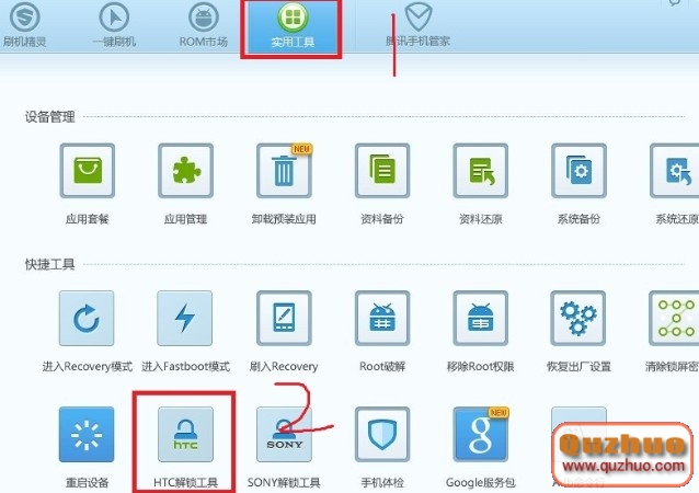 1、手機通過數據線連接www.shuleba.com電腦,刷機精靈識別選擇實用工具-HTC解鎖工具,如圖: