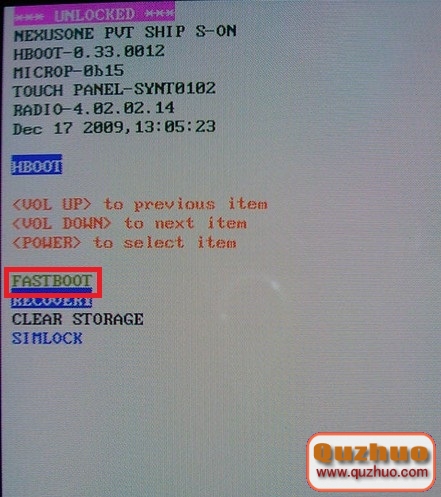 1、①解壓“X920e一鍵輸入Recovery” ②把下載來的ROM包拷貝進手機大容量儲存③關機狀態下按住“音量-”鍵+“電源鍵”保存3-5秒進入FASTBOOT模式④選擇第一項FASTBOOT,進入Bootloader模式,如圖: