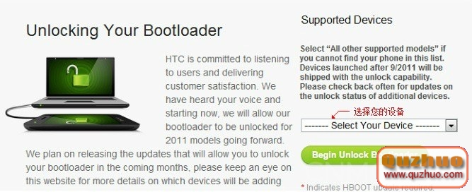 5).進入解鎖頁面後,選擇您的機型(沒有你的機型就選最後一項),然後點擊「Begin Unlock Bootloader」