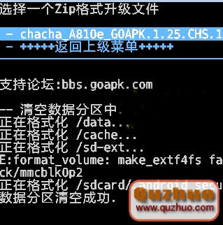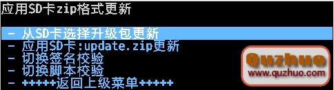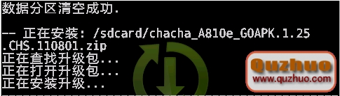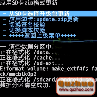 11、選擇 -從SD卡選擇升級包更新(choose zip from sdcard),按電源鍵確認,進入以下界面,如下圖: