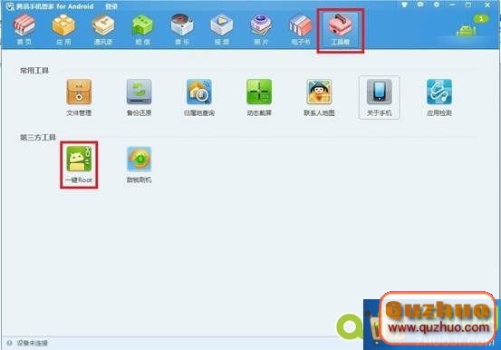 1.下載並打開騰訊手機管家,將www.shuleba.com電腦和手機用數據線連接,進入手機管家工具箱找到一鍵Root。