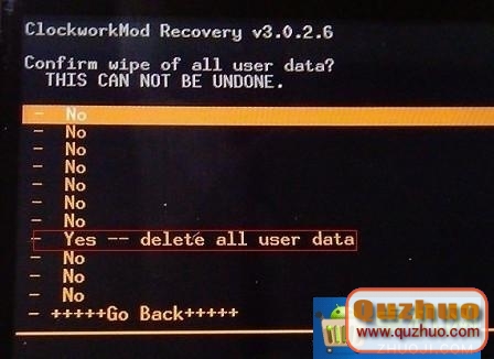 選擇Wipe DATA/Factory reset(中文版:清空DATA恢復出廠設置),然後再選擇delete all user data(中文版:刪除全部用戶數據)