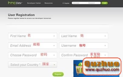 到htcdev.com/bootloader,點頁面頂部的“Register”注冊賬號,注意郵箱一定要真實有效並且按提示激活,因為解碼鎖最後是發到你的注冊郵箱。