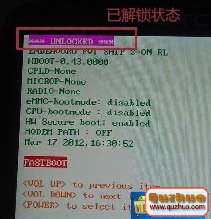 檢驗解鎖是否成功:關機->按住音量下鍵+開機鍵->進入HBOOT,看第一行是否顯示Unlocked,是即為解鎖成功。