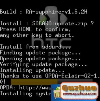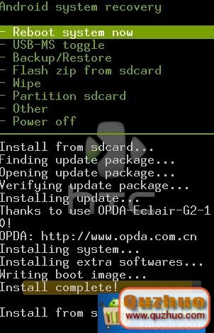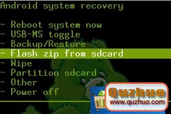 然後關機,按住Home小房子鍵的同時按開機鍵,即可進入recovery恢復模式,然後移動軌跡球到第四項,按下軌跡球選擇進入“Flash zip from sdcard”