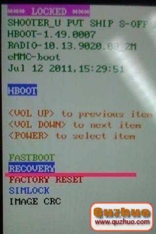 2:手機完全關機,或者扣出電池在裝上開機,然後按住音量鍵下+開機鍵開機,手機會進入HBOOT 模式了,然後按音量鍵選中recovery之後,再按一下電源鍵確認,進入recovery模式了