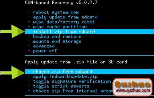 3:進入recovery之後,選擇"install zip from sdcard"並確認,選擇"choose zip from sdcard"並確認,選擇剛才拷到SD卡中的zip格式的root刷機包並確認。選擇"Yes - install XXXXXXXXXXXX.zip "並確認。